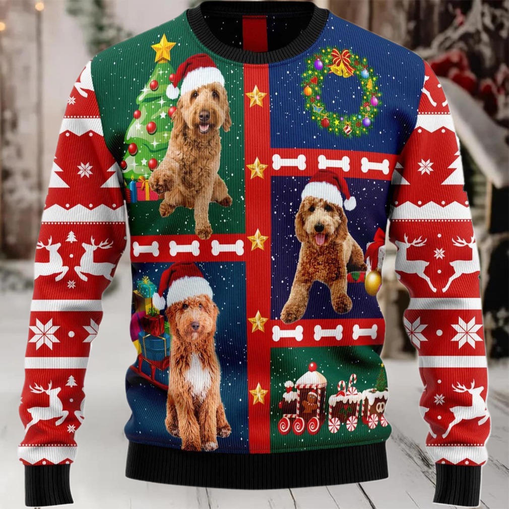 This isn’t just any Christmas sweater; it’s a celebration of goldendoodles in all their holiday glory! The charming design is guaranteed to bring smiles and chuckles wherever you go. Imagine stealing the show at your next Christmas party with this irresistibly cute sweater. This sweater solves the problem of boring holiday outfits, offering a delightful and memorable option for goldendoodle enthusiasts. Made from a soft and cozy material, it’s perfect for staying warm and comfortable all winter long. Available in a variety of sizes, it ensures a comfortable and flattering fit for everyone.