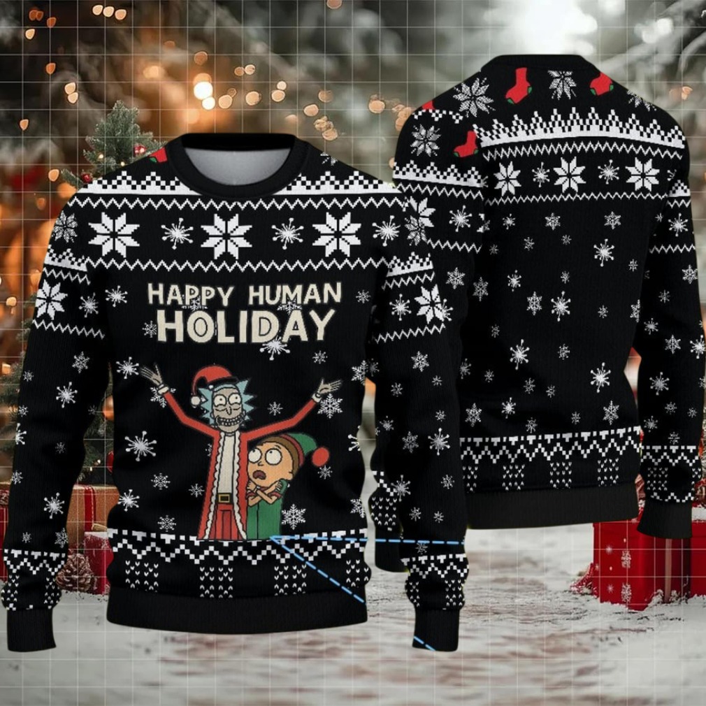 Wubba Lubba Dub Dub! Get ready to schwift into the holiday season with this Black Ugly Christmas Sweater featuring Rick and Morty. Decked out with a white snowflake pattern and the phrase “Happy Human Holiday,” this sweater is perfect for fans who want to show off their interdimensional style. Be the Rickest Rick at your Christmas party and let everyone know you’re not afraid to get schwifty!