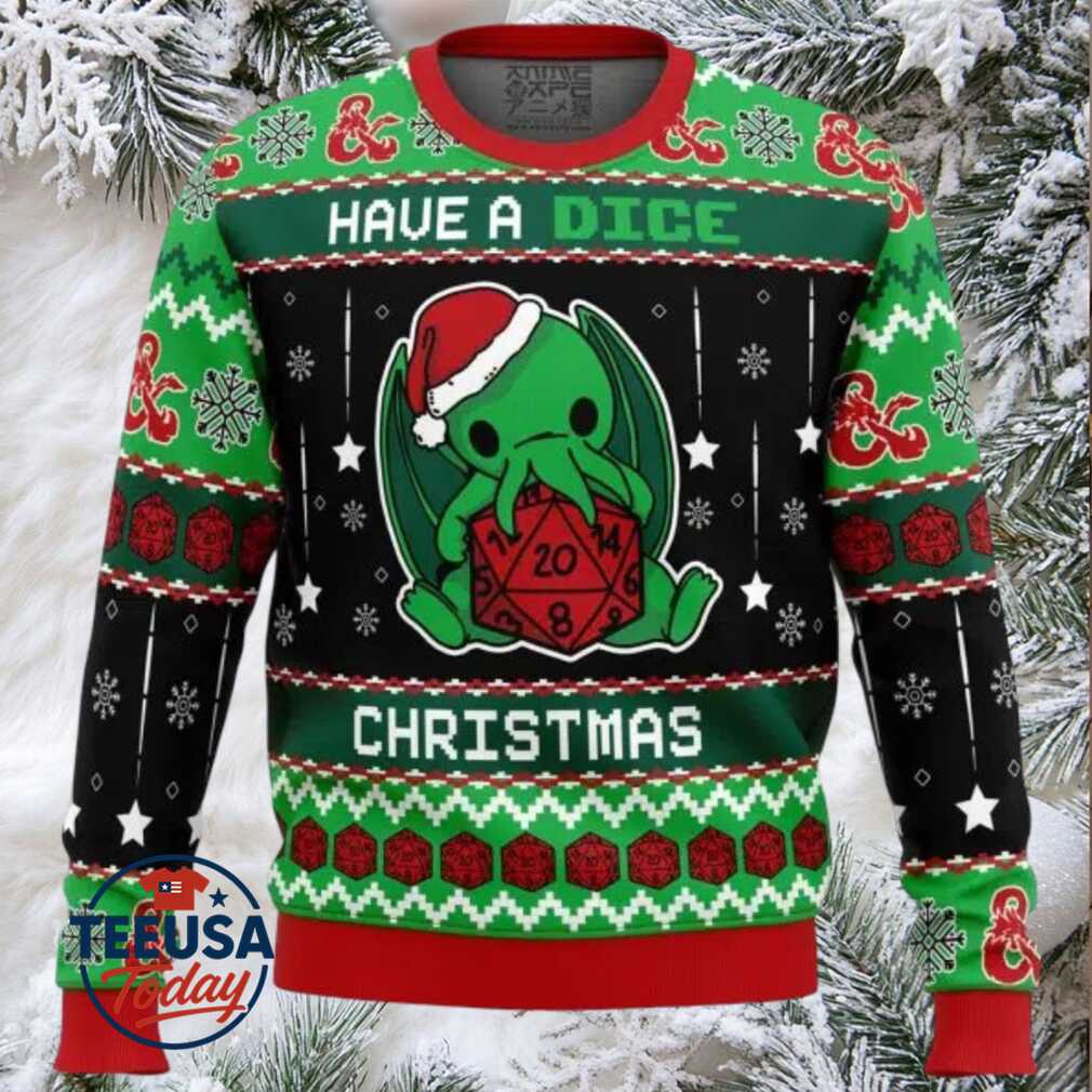Roll for initiative this holiday season with the Cthulhu Have A Dice Dungeons & Dragons Ugly Christmas Sweater! This unique sweater combines the festive spirit with a touch of Lovecraftian horror and tabletop gaming. It’s perfect for those who like their Christmas with a side of adventure and ancient cosmic entities. Get ready to be the most talked-about guest at your next holiday gathering!