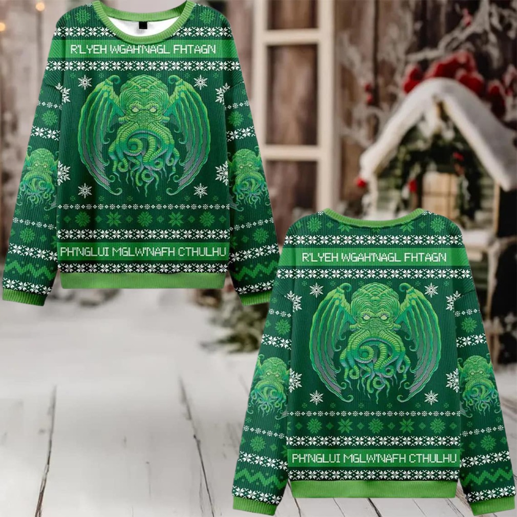 Forget mundane reindeer and snowflakes. This Cthulhu Ugly Sweater takes holiday fashion to a whole new dimension. The intricate design features iconic Lovecraftian imagery, including the unpronounceable incantation, making it a truly unique piece for fans of the Cthulhu Mythos. Crafted from a comfortable, breathable fabric blend, this Lovecraftian ugly sweater is perfect for surviving long holiday rituals or simply lounging while contemplating the vastness of the cosmos. It’s designed for a relaxed fit, ensuring you can comfortably summon ancient beings or simply enjoy some eggnog.