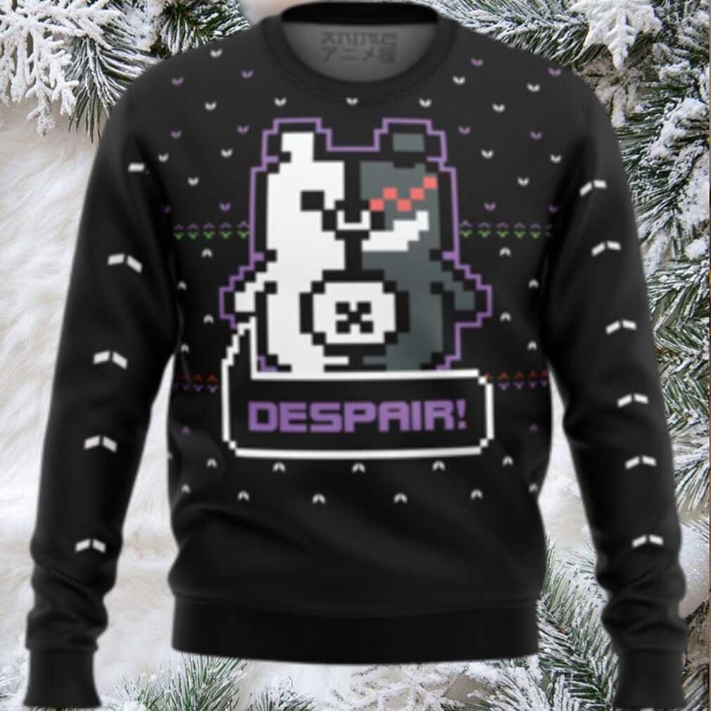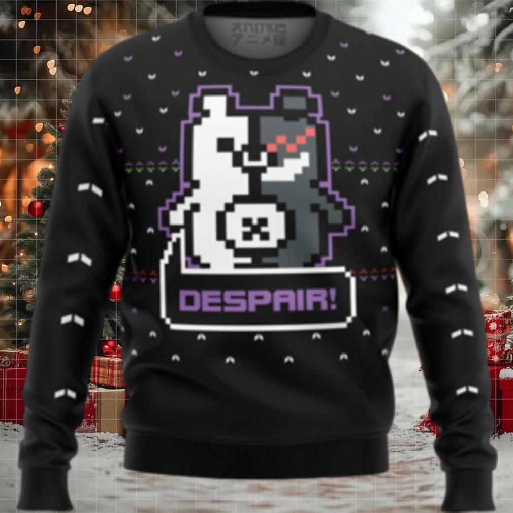 Get ready to spread some despair this holiday season with the Danganronpa Monokuma Despair Ugly Christmas Sweater! This sweater isn’t just a piece of clothing; it’s a statement of your love for Danganronpa, a conversation starter, and a unique way to celebrate Christmas with a touch of dark humor.