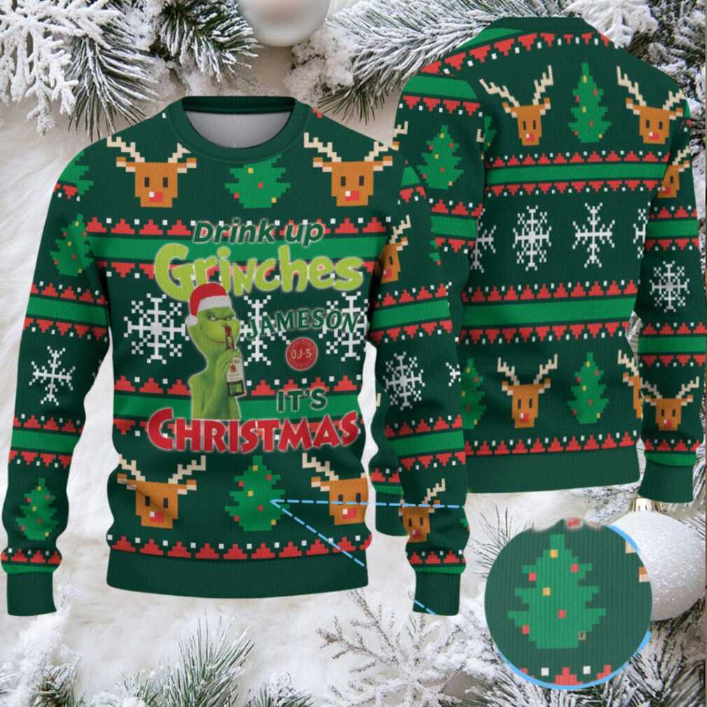 Christmas is a time for traditions, but who says traditions can’t be a little bit twisted? This Dark Green Reindeer and Christmas Tree Pattern “Drink Up Grinches – It’s Christmas” Ugly Christmas Sweater isn’t your grandma’s classic knitwear. It’s a celebration of holiday spirit with a wink and a nod to everyone’s favorite Christmas curmudgeon, plus a splash of Jameson for good measure. Get ready to turn heads and spread some irreverent cheer!