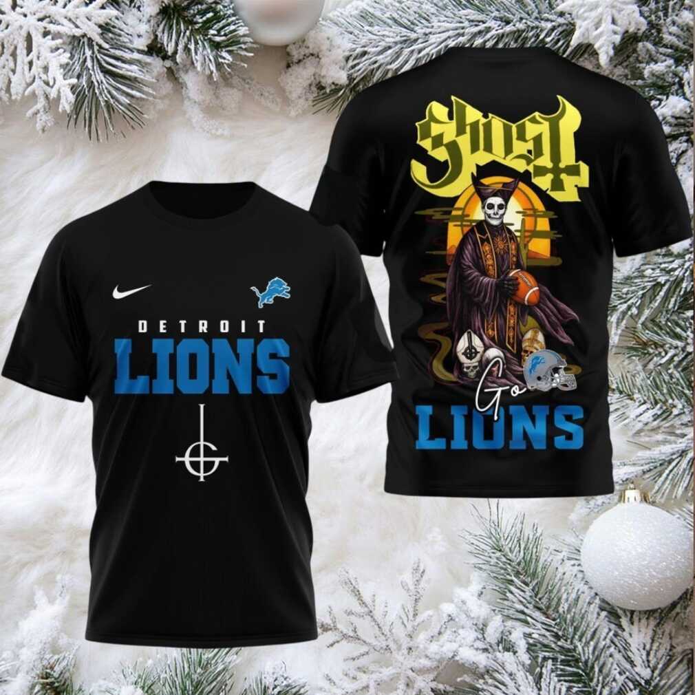 The Detroit Lions NFL Ghost Band Shirt is designed for the fan who stands out from the crowd. Made from a comfortable, breathable cotton blend, it’s built for both cheering on your team and rocking out to your favorite tunes. The front of the shirt, as seen in the first image, features a bold graphic that perfectly blends the iconic imagery of the Ghost band with the fierce spirit of the Detroit Lions. This shirt solves the problem of generic fan apparel, giving you a piece that’s as unique as your passions. It offers a fresh, alternative style that lets you express your dual love for football and rock music in one eye-catching design. Available in various sizes, it offers a relaxed and comfortable fit for everyone.