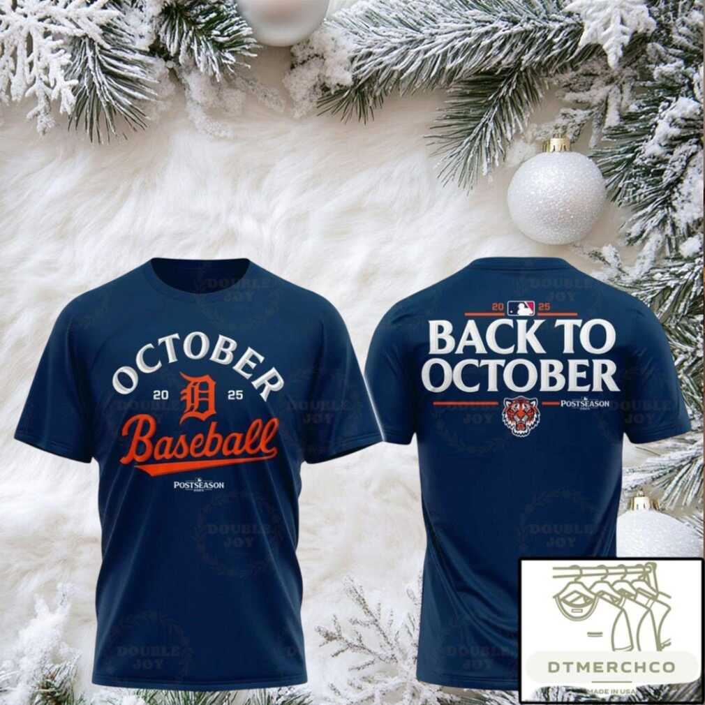 This Detroit Tigers Back To OCTOBER 2025 shirt is designed for the true fan. The design embodies the Tigers’ drive to the postseason. Made from a comfortable cotton blend, this shirt provides superior comfort and durability. Whether you’re at the stadium, watching from home, or hitting the streets, this shirt will keep you feeling cool and comfortable while showcasing your team allegiance. Available in various sizes to ensure the perfect fit for every dedicated supporter.