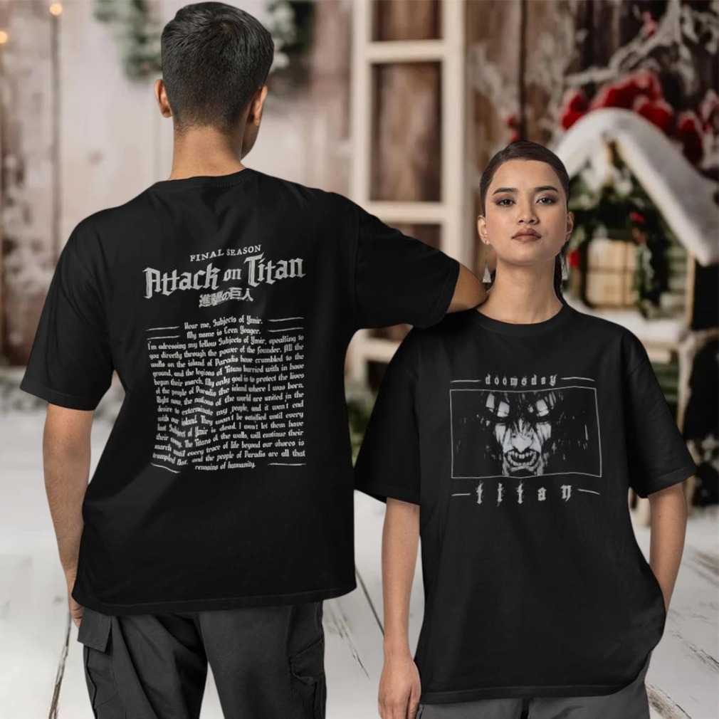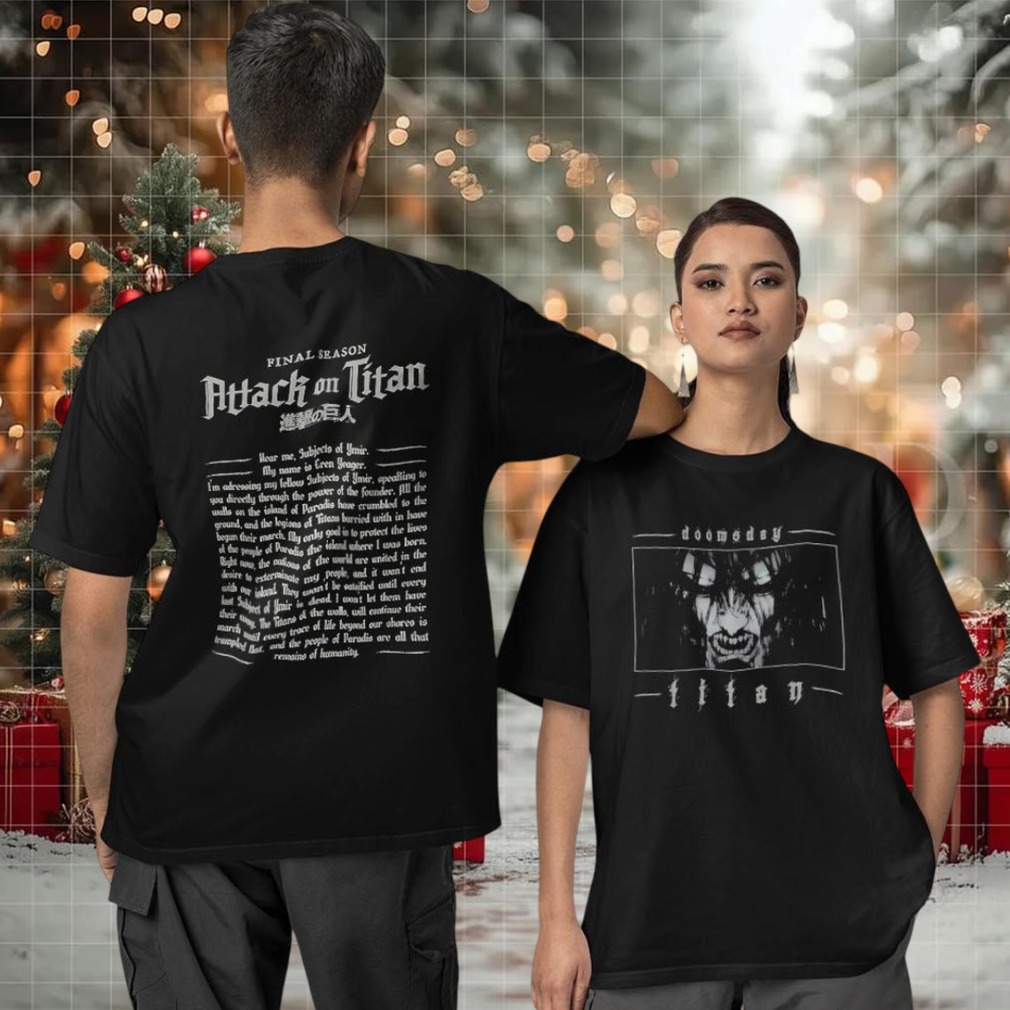 Show your allegiance to the Survey Corps with this Doomsday Titan final season Attack on Titan two-sided T-shirt! Perfect for die-hard fans of the anime, this tee captures the intensity of the final season. If you’re looking for a way to express your passion for Attack on Titan, this shirt is a must-have.