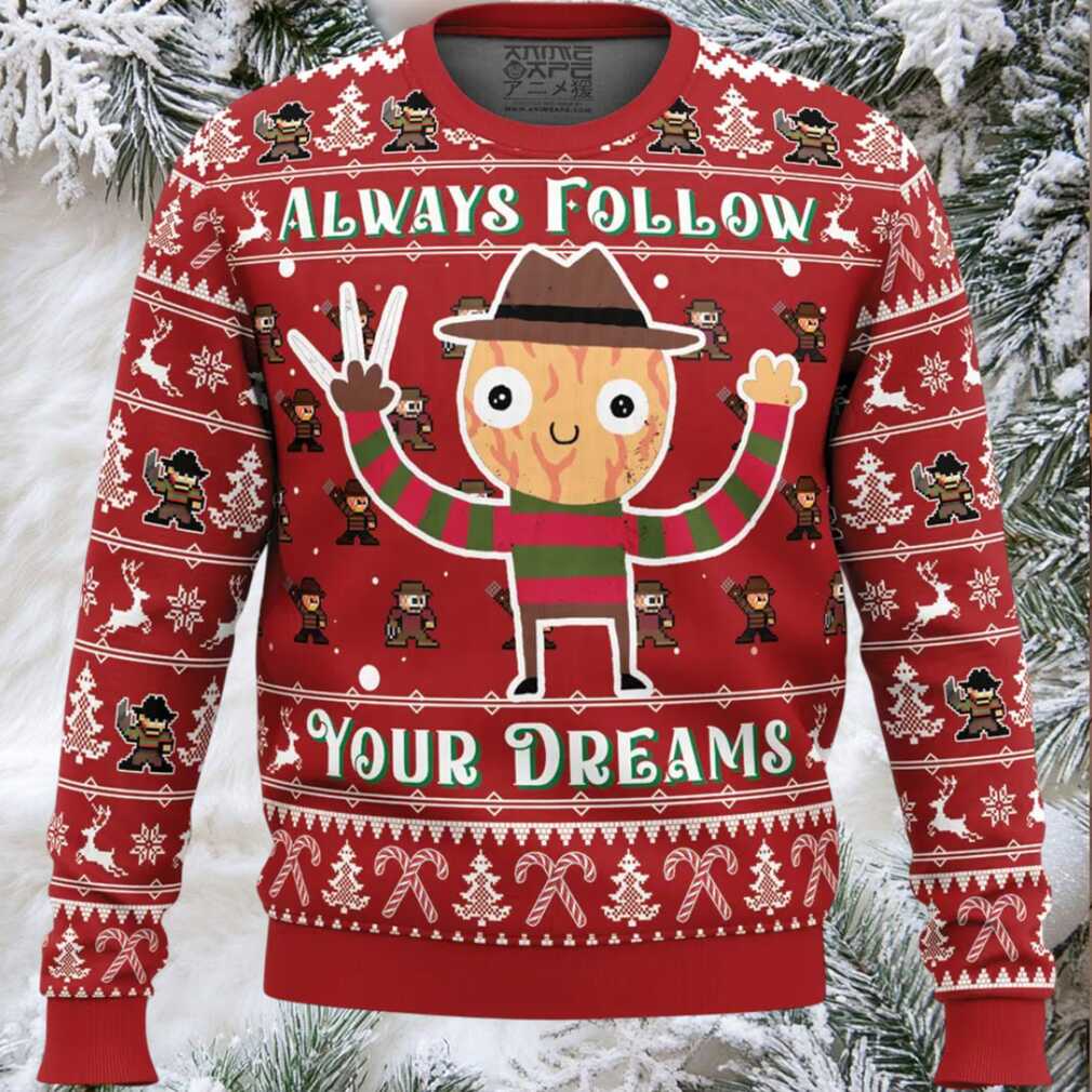 Sleep tight…or maybe not! This Follow Your Dreams Nightmare on Elm Street Ugly Christmas Sweater is the perfect way to blend holiday cheer with your favorite horror classic. It’s a conversation starter that’s sure to bring some frightful fun to your festive gatherings.