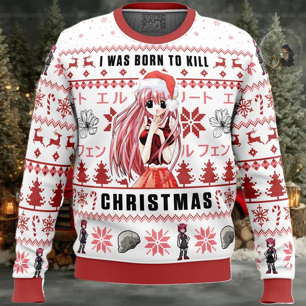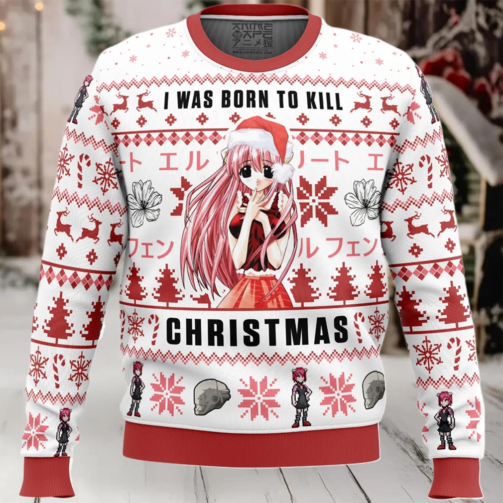 Looking for a Christmas sweater that’s a little less “ho ho ho” and a little more “oh no no”? This “I was Born to Kill” Elfen Lied Ugly Christmas Sweater is your answer. It’s a darkly humorous twist on holiday cheer, perfect for fans of Elfen Lied who want to make a seriously edgy statement this Christmas season. Get ready to shock and amuse!