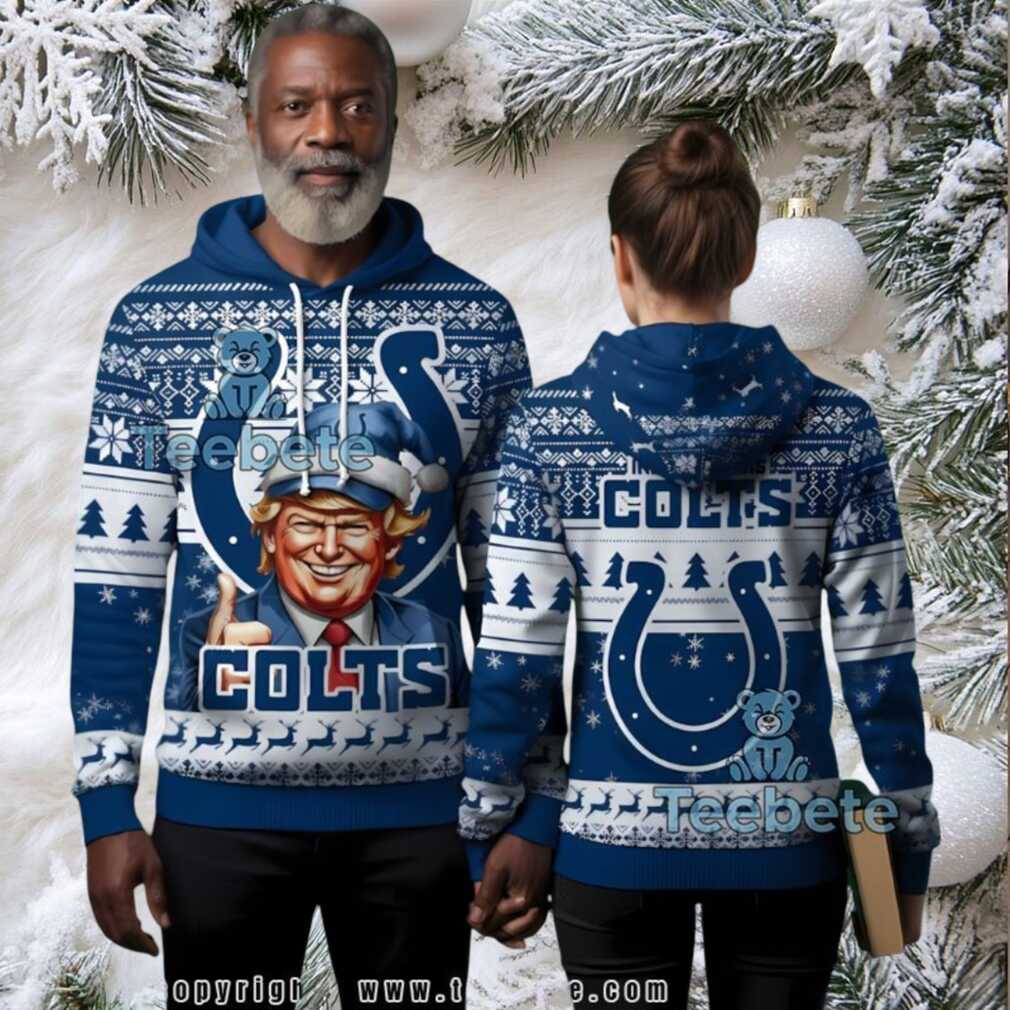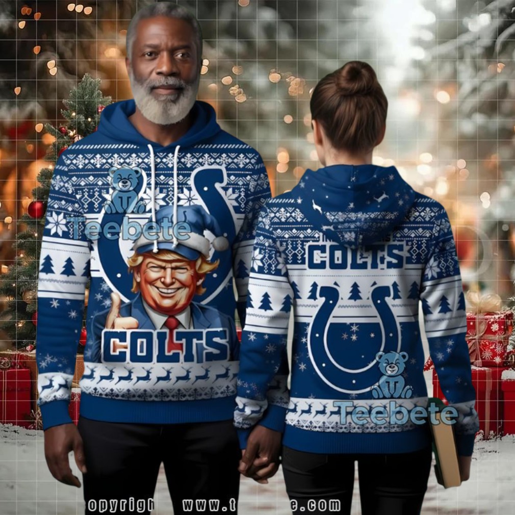 Make Christmas Great Again! Picture this: Lucas Oil Stadium is rocking, the Colts are marching down the field, and you’re not just wearing any fan gear. You’re sporting the Indianapolis Colts Donald Trump Fan Ugly Christmas 3D Hoodie. It’s the ultimate conversation starter, a festive fusion of football fandom and political pride.