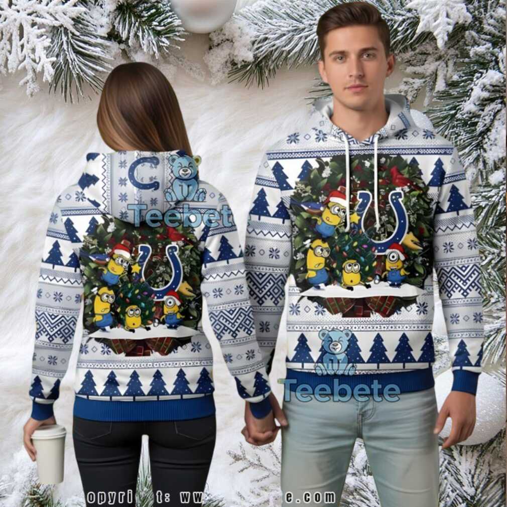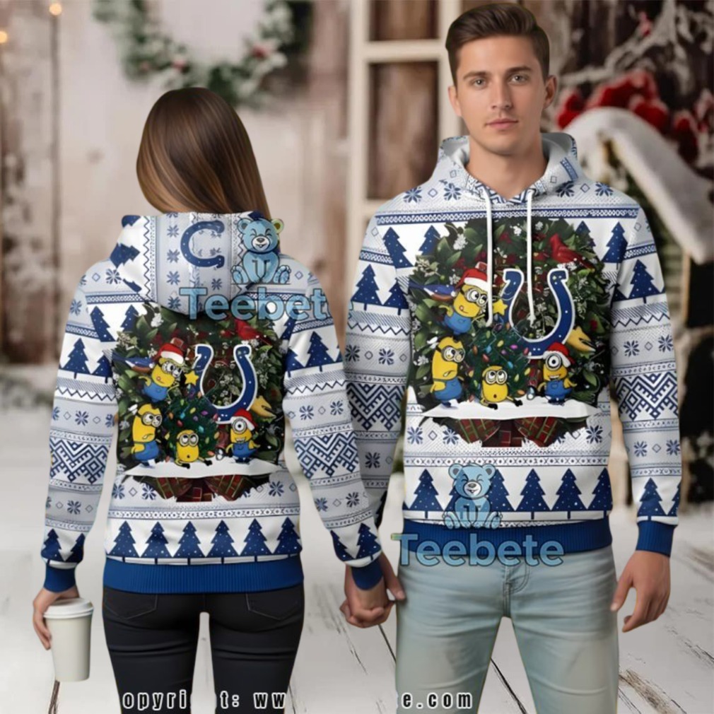 To keep your Indianapolis Colts Minions Ugly Christmas 3D Hoodie Holiday Wreath looking its best, machine wash cold with like colors. Tumble dry low. Avoid ironing the 3D design to preserve its whimsical charm for seasons to come.