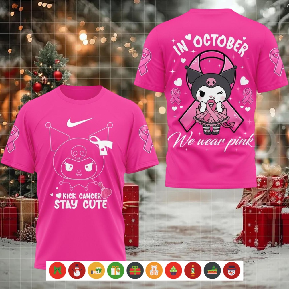 This Kuromi In October We Wear Pink Shirt is more than just a cute design; it’s a symbol of support. Made from a soft and comfortable cotton blend, it’s perfect for wearing throughout October and beyond. The vibrant pink color and eye-catching Kuromi graphic make it a standout piece. Wear it to breast cancer awareness walks, fundraising events, or simply as a daily reminder to support the cause. Available in a range of sizes for a perfect fit.