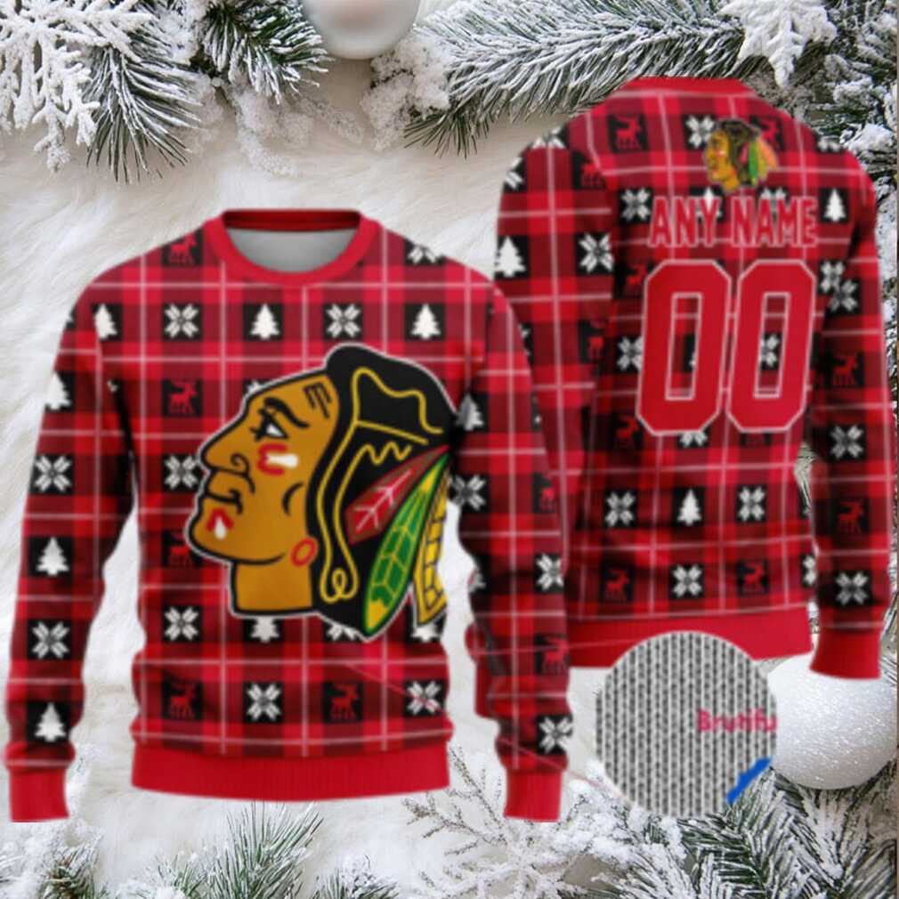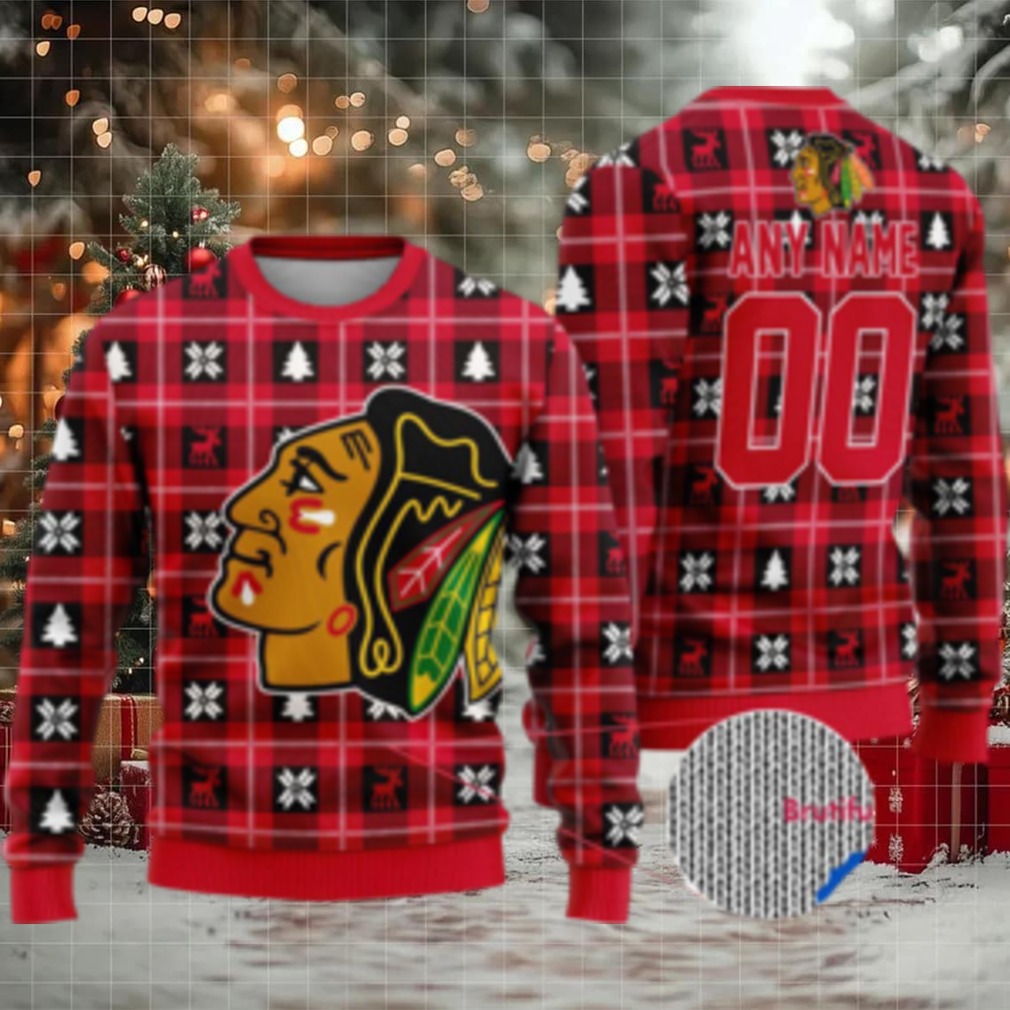This sweater is ideal for any die-hard Chicago Blackhawks fan who wants to celebrate Christmas in a personal and spirited way. Wear it to holiday parties, game day events, or even just around town to show off your team pride. It also makes an unforgettable gift for any Blackhawks enthusiast in your life. Imagine their joy when they open this awesome and personalized present! It’s a guaranteed conversation starter and a holiday favorite. Second images for more details.