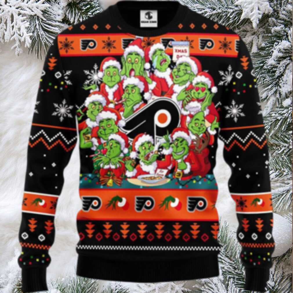 This Philadelphia Flyers Christmas sweater features the Grinch in 12 different expressions, making it a must-have for fans of the team and the classic Christmas character. This sweater lets you showcase your hockey allegiance with holiday fun. It’s the perfect way to connect with fellow Flyers fans and spread some holiday spirit (or Grinchy-ness!). Made with a comfortable cotton blend, this sweater is ideal for those long game nights or holiday gatherings. Available in a range of sizes, it offers a cozy fit for everyone.