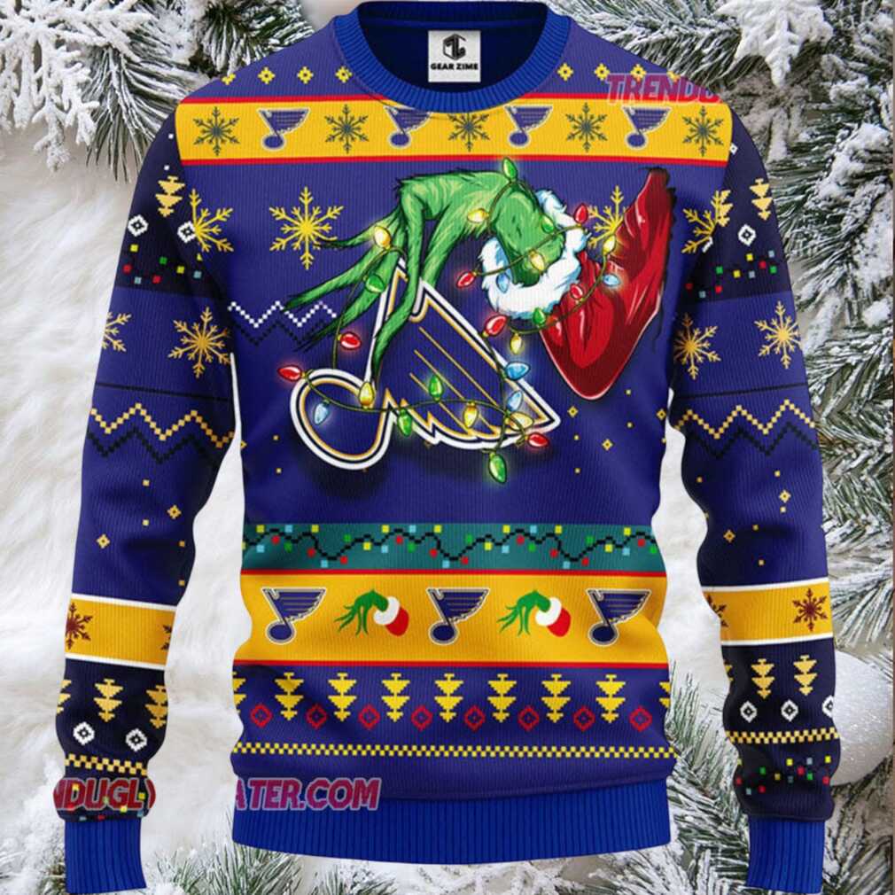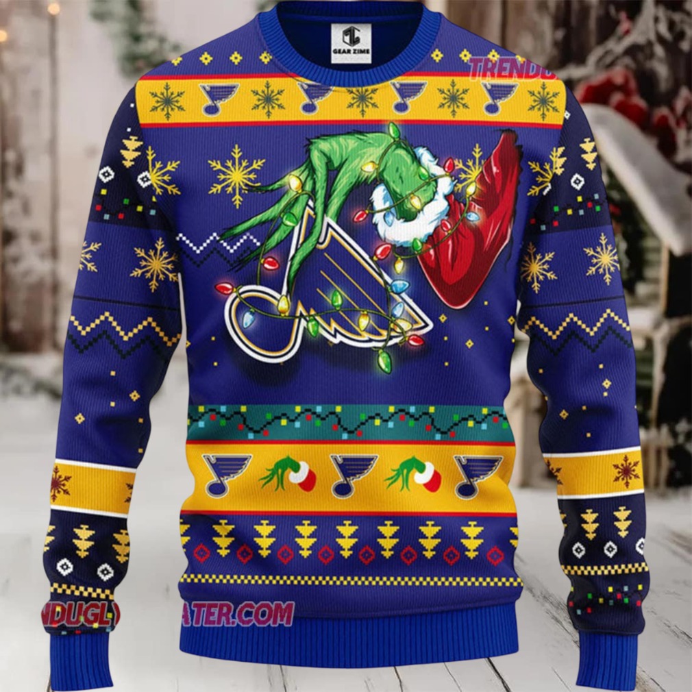 This NHL St Louis Blues Grinch Hand Ugly Christmas Sweater is the perfect blend of holiday mischief and hockey fandom. Pair it with your favorite jeans or a festive skirt for a standout look. It solves the problem of generic holiday attire and caters to the fan who wants to express their unique personality. Made with a comfortable, high-quality knit, this sweater will keep you cozy whether you’re at the game or celebrating at home. Available in sizes S-5XL, finding your perfect fit is easy.