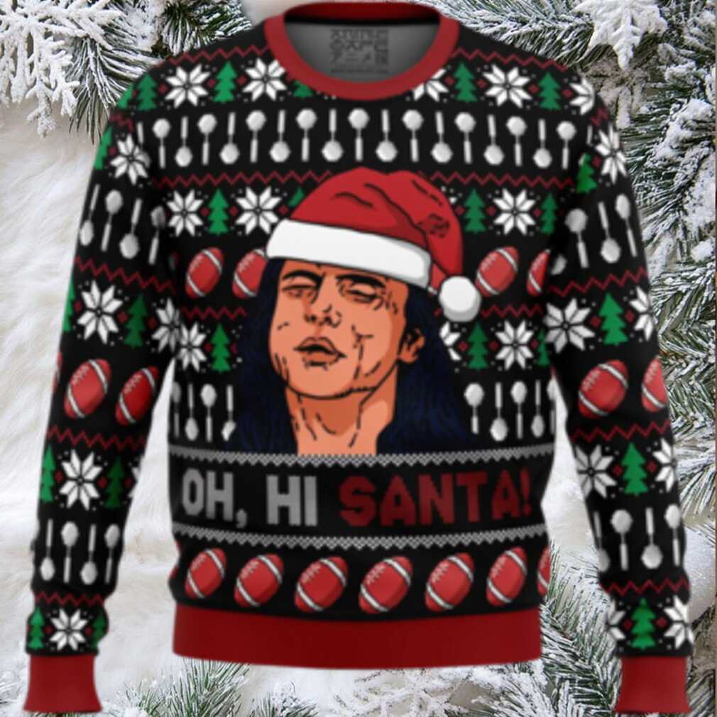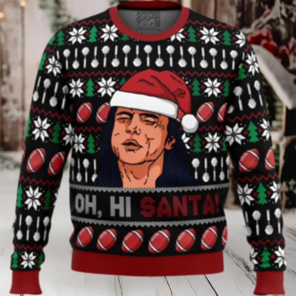 Have yourself a wonderfully awkward Christmas with this “Oh, Hi Santa” The Room Ugly Christmas Sweater! Featuring the iconic line from the cult classic movie, this sweater is sure to get laughs and start conversations. Perfect for fans of Tommy Wiseau and The Room who want to add a touch of bizarre humor to their holiday wardrobe.