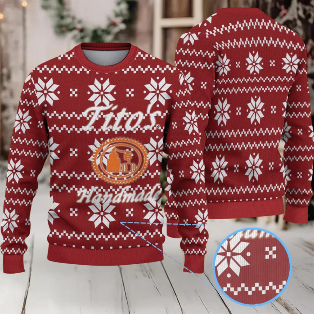 To ensure your Red White Snowflake Pattern Tito’s Handmade Vodka Ugly Christmas Sweater remains a festive favorite for years to come, machine wash cold with similar colors and tumble dry on low. Avoid using bleach or ironing directly on the design to maintain its vibrancy. Store it in a cool, dry place to prevent any unwanted shrinkage or damage. With a little love and care, this sweater will be your go-to holiday attire for many seasons.