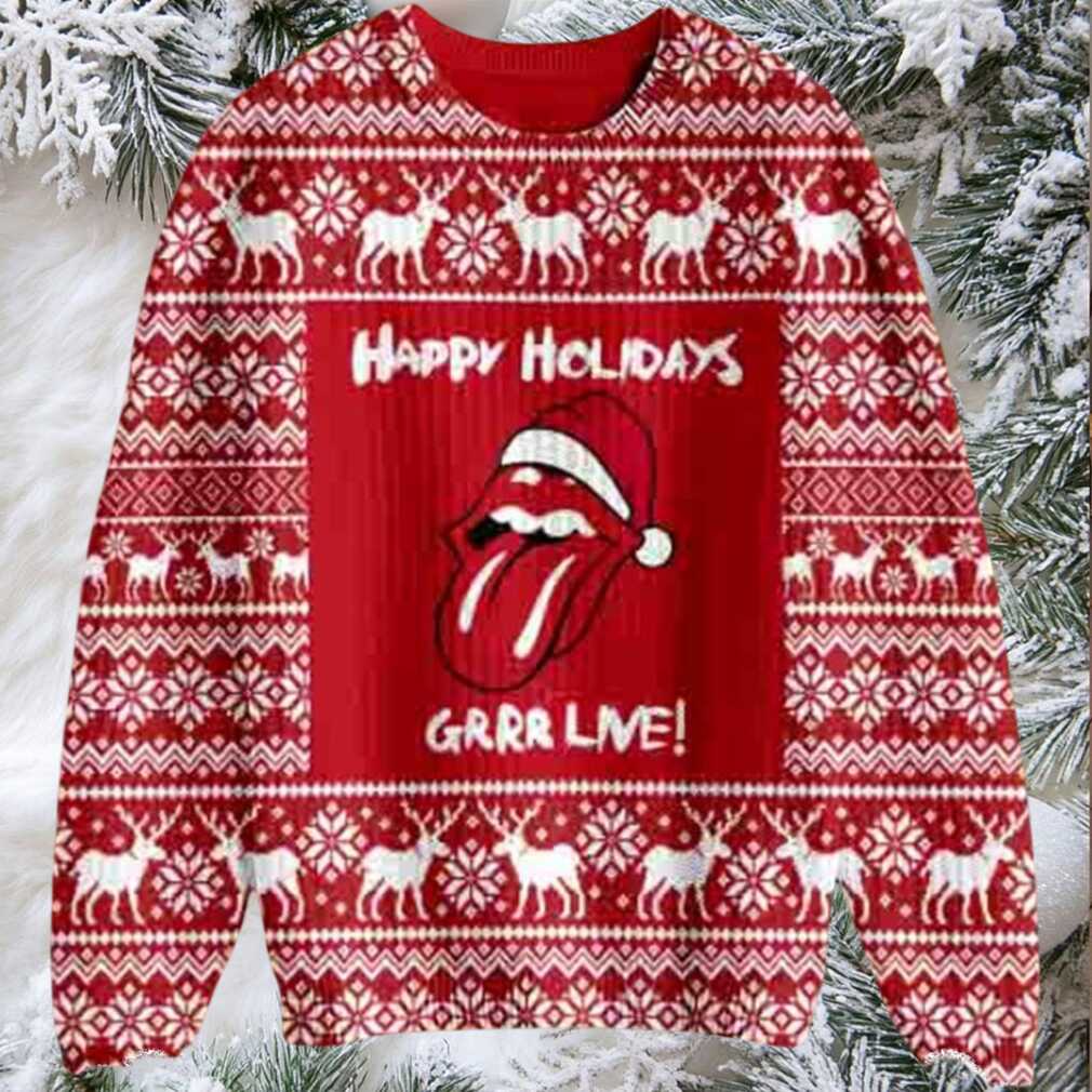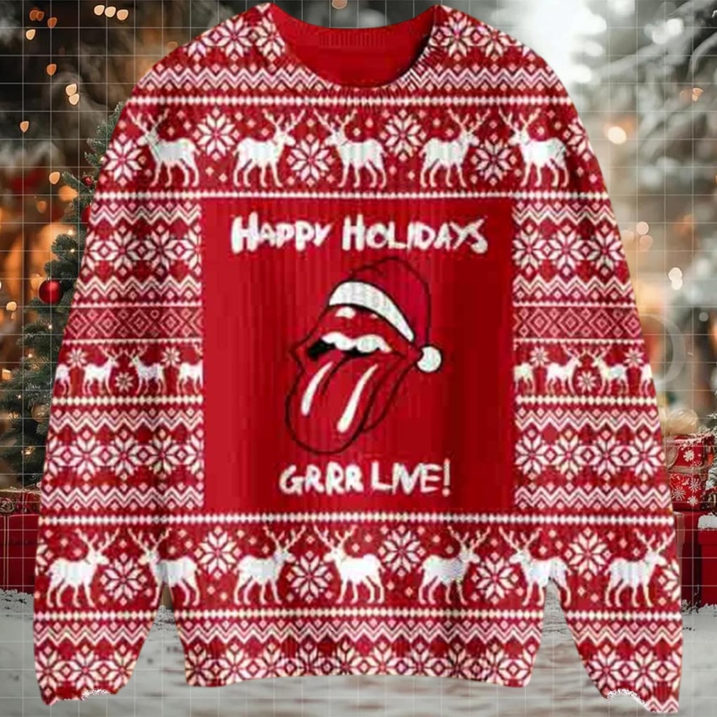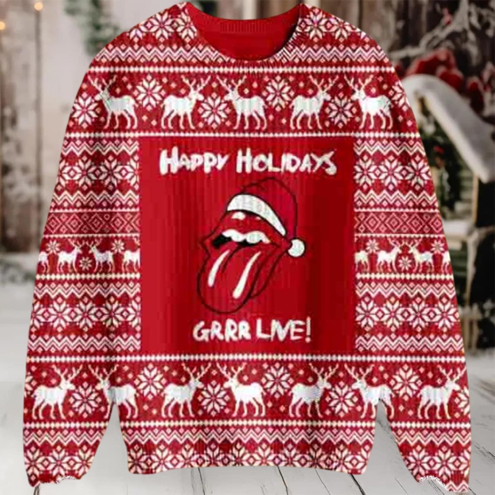 Rock the holidays with this Rolling Stones “Happy Holidays Grrr Live” Ugly Christmas Sweater! Featuring a fun reindeer pattern and the iconic tongue logo, this knitted sweater is perfect for fans who want to stand out. Whether you’re attending a festive party or just spreading some cheer, this sweater is a bold and humorous choice.