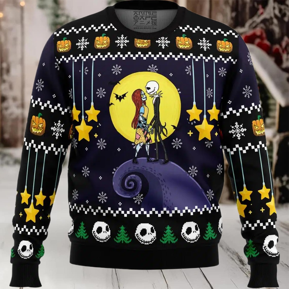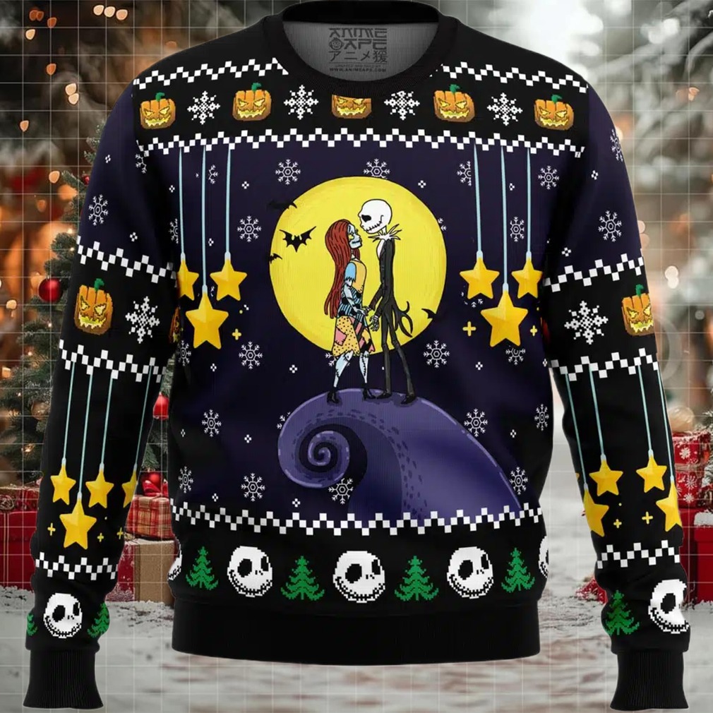This holiday season, embrace the romance with a touch of spooky charm with this “Romantic Nightmare The Nightmare Before Christmas Ugly Christmas Sweater”! Perfect for fans of Tim Burton’s classic film, this sweater features Jack Skellington and Sally in a festive (and slightly eerie) design. It’s the ideal way to show off your love for this iconic movie while spreading holiday cheer with a unique twist.