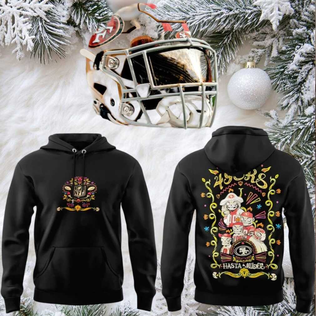 This San Francisco 49ers Hasta La Muerte two-sided hoodie shirt is the ultimate way to showcase your dedication to the team, come what may. With its striking “Hasta La Muerte” design, this hoodie connects you to the heart and soul of the 49ers fanbase. Crafted from a comfortable cotton blend, it’s perfect for cheering on the team at Levi’s Stadium or representing the 49ers wherever you go. Get yours today, and let everyone know where your allegiance lies!
