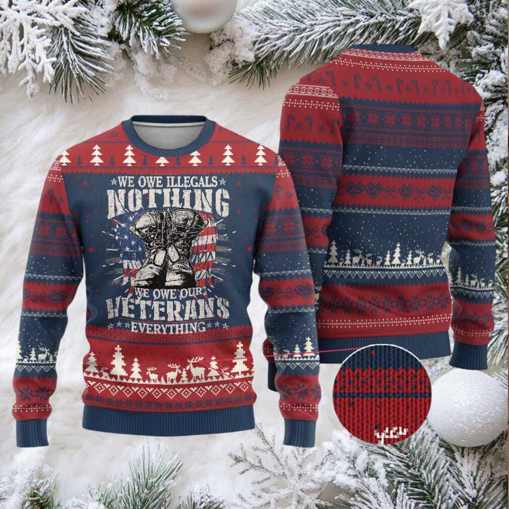 Show your unwavering support for our veterans this Christmas with this bold Veterans Day Ugly Christmas Sweater. Featuring the powerful message “We Owe Illegals Nothing, Veterans Everything,” this sweater is perfect for making a statement and honoring those who served. Imagine sparking meaningful conversations and standing out with a sweater that reflects your values this holiday season.