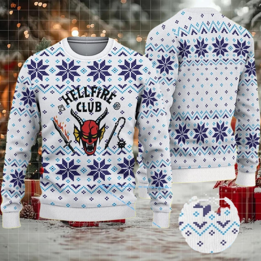 Declare your allegiance to the Hellfire Club this holiday season with this epic White and Blue Fair Isle Ugly Christmas Sweater! Featuring a design inspired by Stranger Things, complete with snowflakes, flaming swords, and chain icons, this sweater is the perfect way to show off your fandom and your festive spirit. Whether you’re battling demogorgons or attending a holiday party, this sweater is guaranteed to turn heads and spark conversations. Just try not to summon anything from the Upside Down.