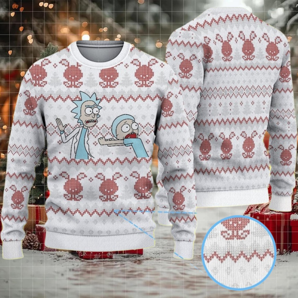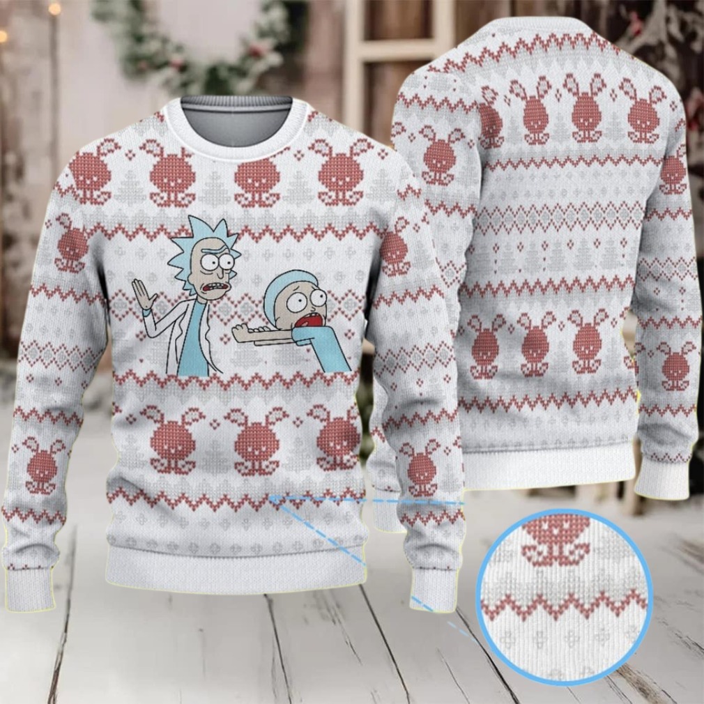 This sweater isn’t just another piece of apparel; it’s a portal to a funnier, more festive dimension. Imagine the laughs and high-fives you’ll get from fellow Rick and Morty fans when they see you sporting this unique design! This sweater combines the traditional Christmas sweater vibe with the show’s iconic characters. Perfect for holiday parties, binge-watching episodes, or just spreading some chaotic holiday cheer. Made with a soft, comfortable knit, it’s perfect for staying warm while plotting your next interdimensional adventure.