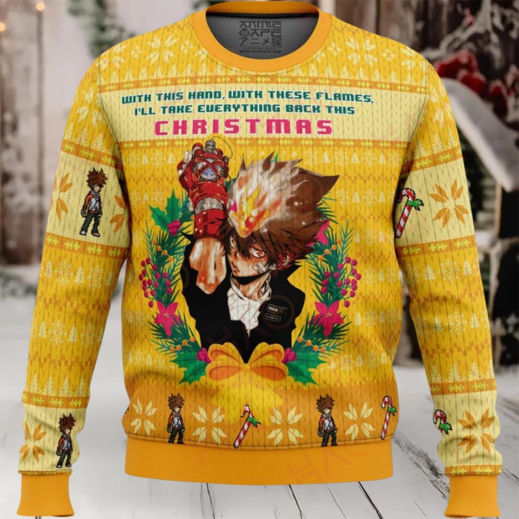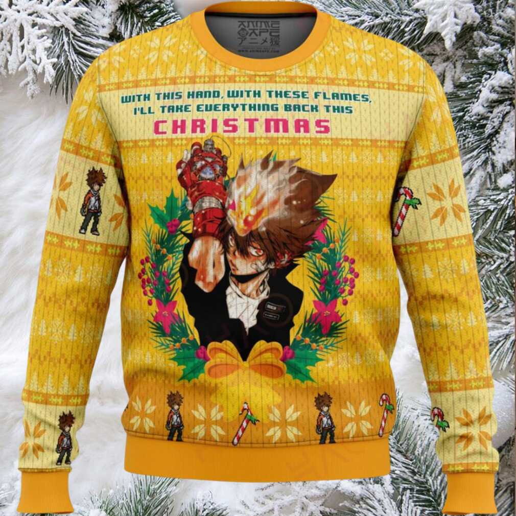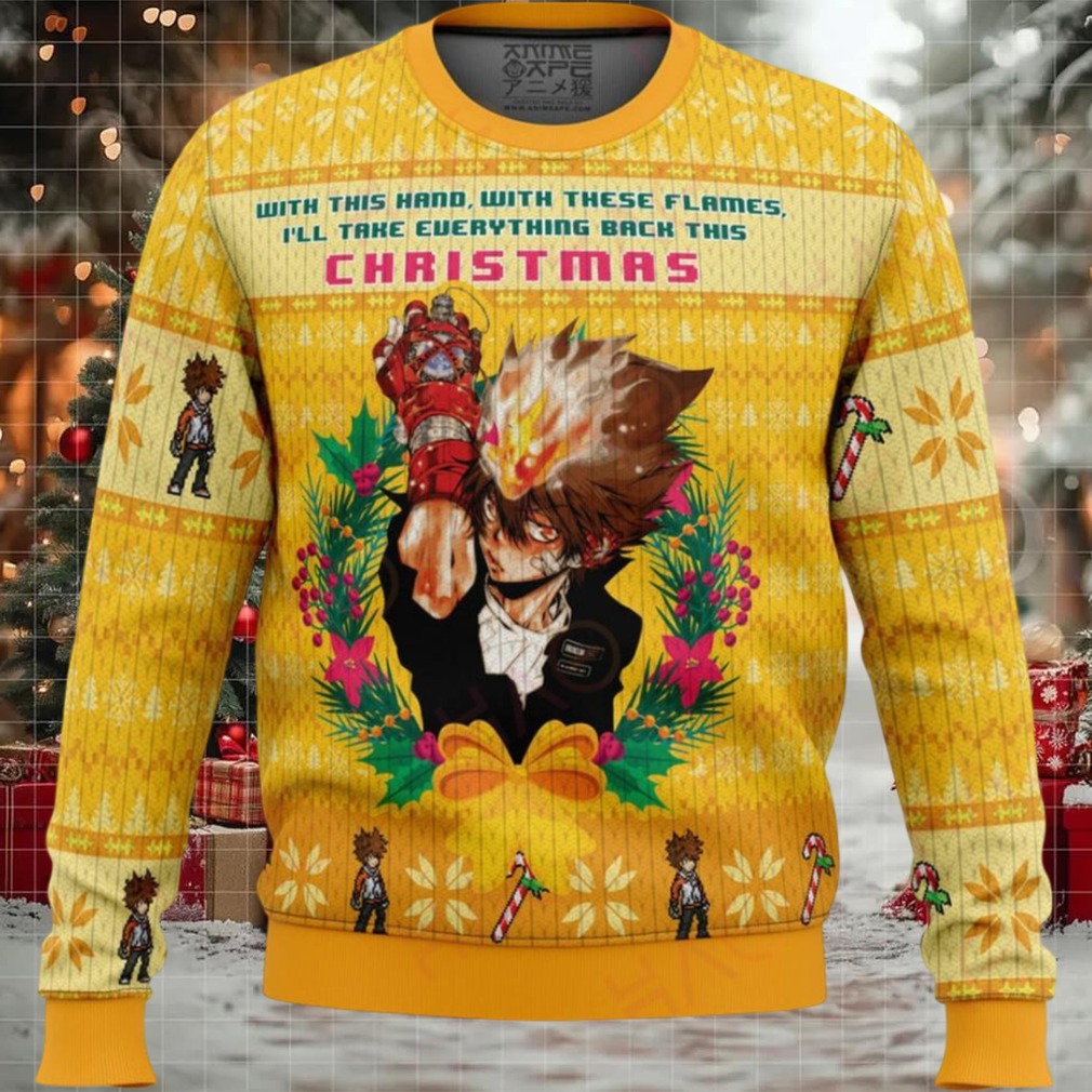 This Katekyo Hitman Reborn Ugly Christmas Sweater is a must-have for any fan. Picture yourself wearing this at your next anime meetup or holiday gathering, standing out with your unique style. Made from a soft and comfortable blend, it’s perfect for those long winter nights. The design features iconic imagery from “Katekyo Hitman Reborn” with a Christmas twist, making it a truly special piece. Available in various sizes, this sweater will let you rep your favorite anime while staying festive!